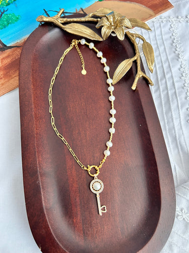 Collar "La Llave de la Elegancia" Collar en perlas a mitad en cadena, colgante de llave.