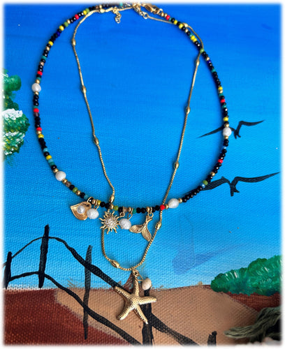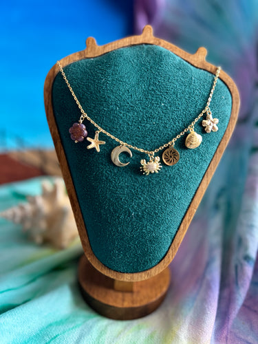 Cadena: Energía del Mar y Cielo" Cadena en oro acero inocidable con diferentes dijes , de playa.