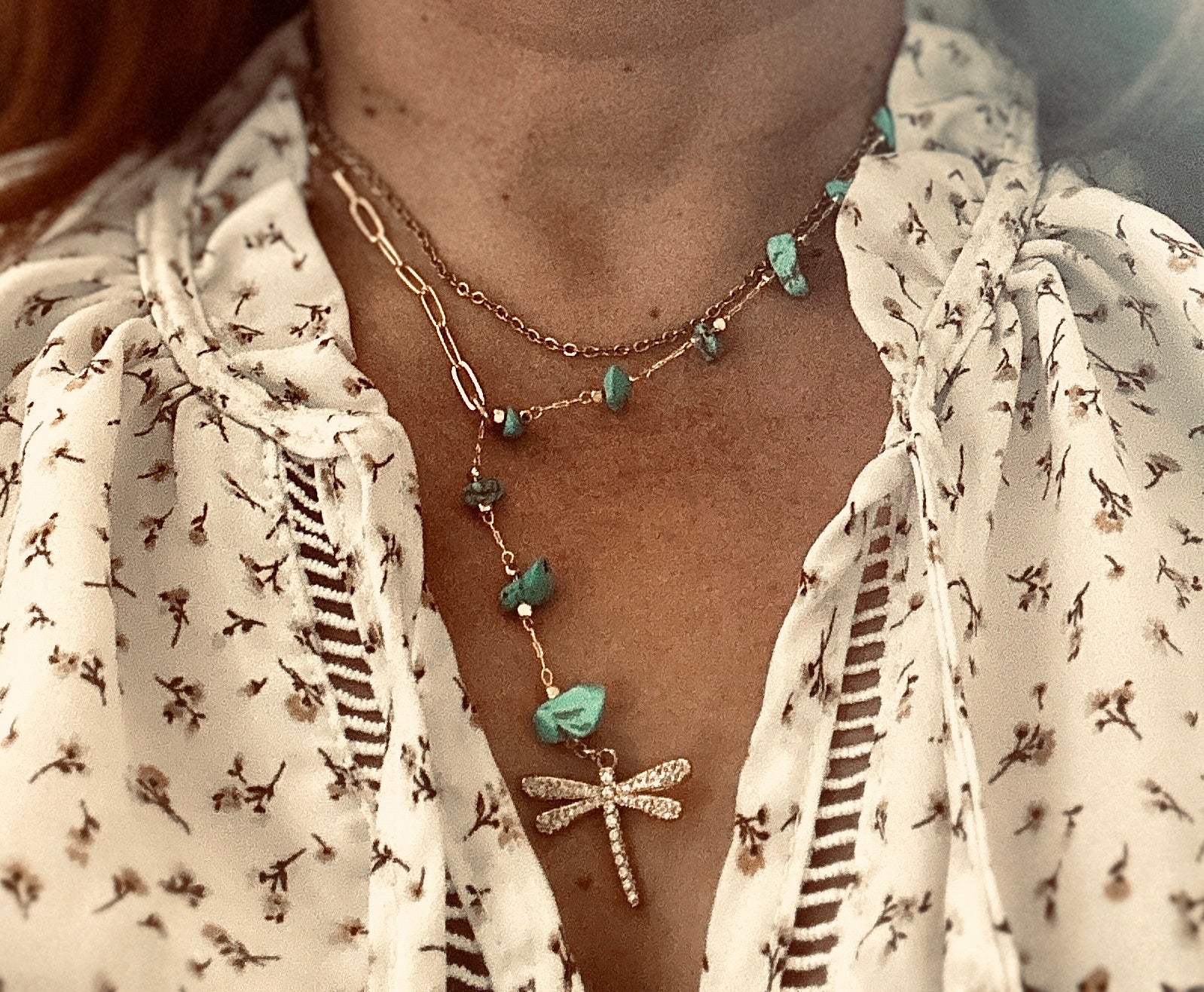 Este collar de diseño asimétrico une lo mejor de dos mundos: una mitad en eslabones dorados que aporta brillo y sofisticación, y la otra mitad en cadena de cuentas turquesa que evoca frescura, naturaleza y vitalidad.
