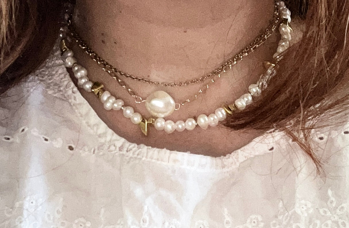 Este delicado collar une la suavidad de las perlas de agua dulce con la luminosidad del gold plate, logrando una pieza refinada y armoniosa.
